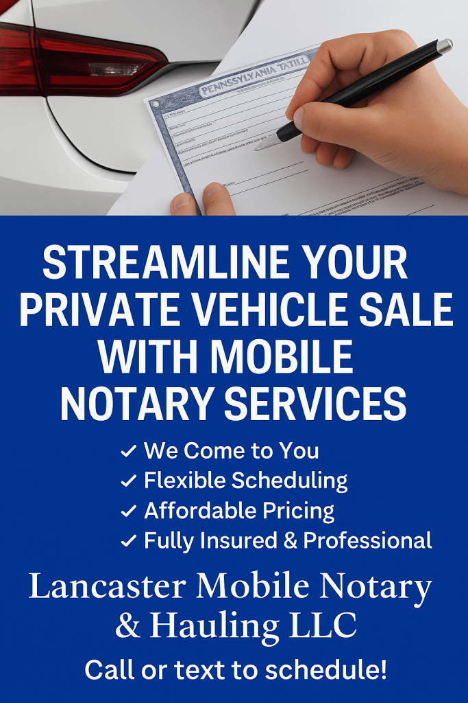 At Lancaster Mobile Notary & Hauling LLC, based in Lancaster, PA, we specialize in mobile vehicle title notarizations — perfect for sellers and buyers who want to save time and avoid the hassle of visiting a notary office.